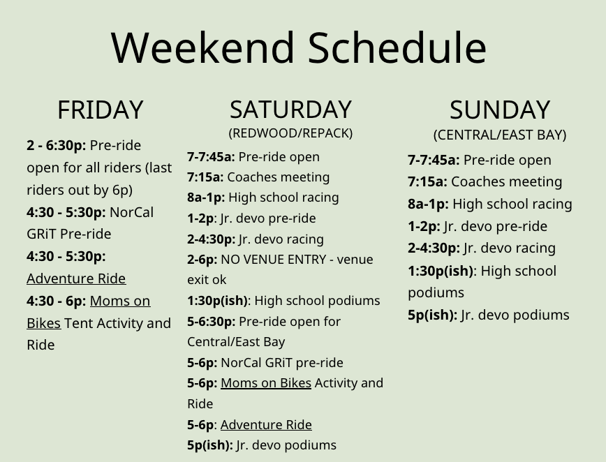 If this is your first race this year, number plates can be picked up at the NICA NorCal registration tent Friday, Saturday or Sunday. Replacement plates can be purchased for $20.